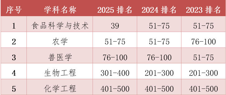 11月18日,高等教育评价专业机构软科正式发布2025“软科世界一流学科排名”。数据显示,我校共有5个学科入选软科世界一流学科,分别是食品科学与技术(39位)、农学(51-75位)、兽医学(76-100位)、生物工程(301-400位)、化学工程(401-500位)。其中食品科学与技术学科首次进入全球前50位,农学、兽医学2个学科也保持全球前100位。