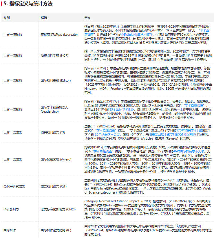 2025年排名新增人工智能、机器人科学与工程两个学科,覆盖理学、工学、生命科学、医学和社会科学五大领域的57个学科,排名指标体系设置世界一流教师、世界一流成果、高水平研究成果、科研影响力、国际合作五个指标模块,全部采用国际可比的客观学术指标。今年有92个国家和地区的2000余所高校的近2万个学科点入围榜单,中国内地共有359所高校的3747个学科上榜。