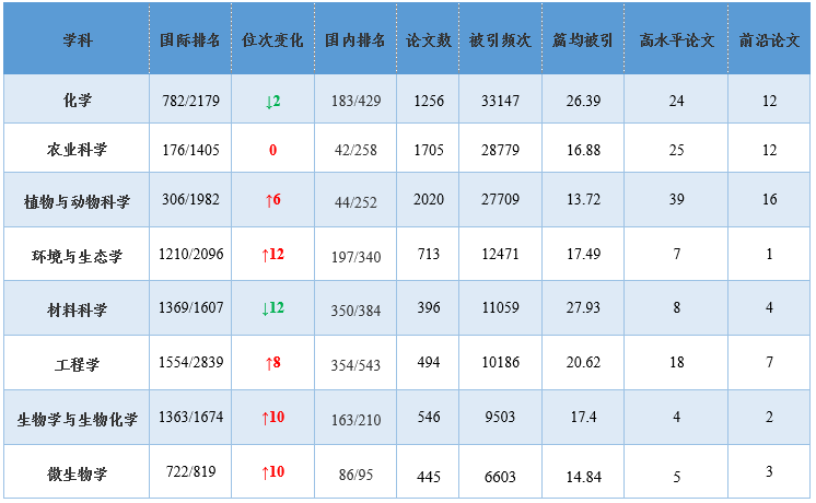 我校植物与动物科学(Plant & Animal Science)、农业科学(Agricultural Sciences)、化学(Chemistry)、环境与生态学(Environment/Ecology)、工程学(Engineering)、材料科学(Materials Science)、生物学与生物化学(Biology & Biochemistry)、微生物学(Microbiology)八个学科稳步保持在ESI全球前1%,详情见表2。