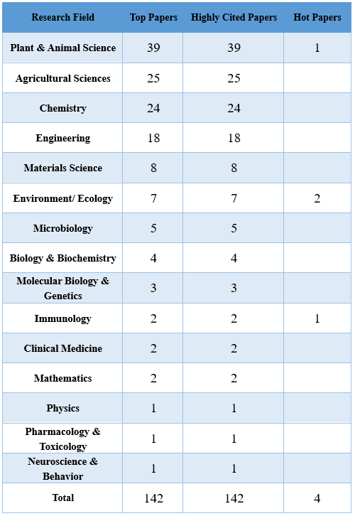 本期我校 ESI 高被引论文共142篇,同上期相比增加5篇,总被引频次22241次,以我校为第一单位发文的论文共67篇,研究领域分布于化学(19篇)、农业科学(18篇)、植物与动物科学(9篇)、工程学(8篇)、材料科学(6篇)、生物学与生物化学(2篇)、环境与生态学(2篇)、免疫学(1篇)、神经系统学与行为学(1篇)、微生物学(1篇),论文详细信息见附件表1。