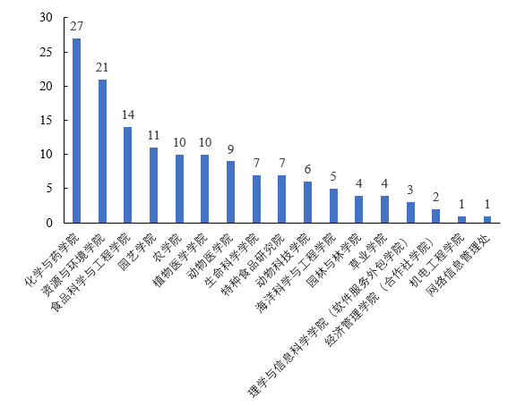 142篇高水平论文的学院和机构分布如图1所示,发文数量位于前三位的是化学与药学院27篇、资源与环境学院21篇、食品科学与工程学院14篇。
